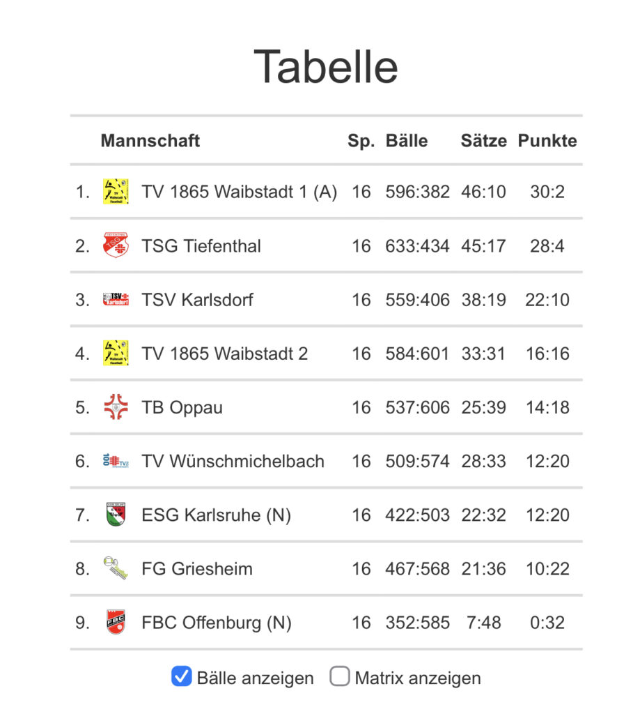 Am letzten Heim Spieltag in der Friedrich List Schule ging es um den Klassenerhalt. Zu Gast waren der TB Oppau und der TV Waibstadt, beide im gesicherten Mittelfeld. Das erste Spiel gegen Oppau wurde nur knapp verloren mit 2:3 Sätzen. Im zweiten Spiel gegen die junge Mannschaft aus Waibstadt holte man sich mit 3:1 die ersehnten 2 Punkte und sicherte sich damit den Klassenerhalt vor dem FG Griesheim und dem FBC Offenburg.